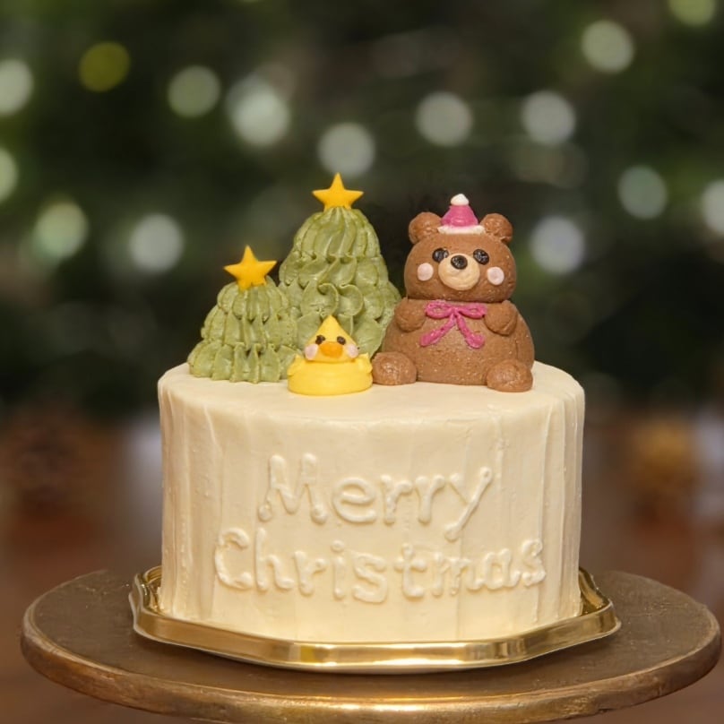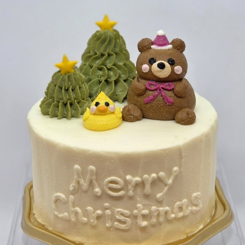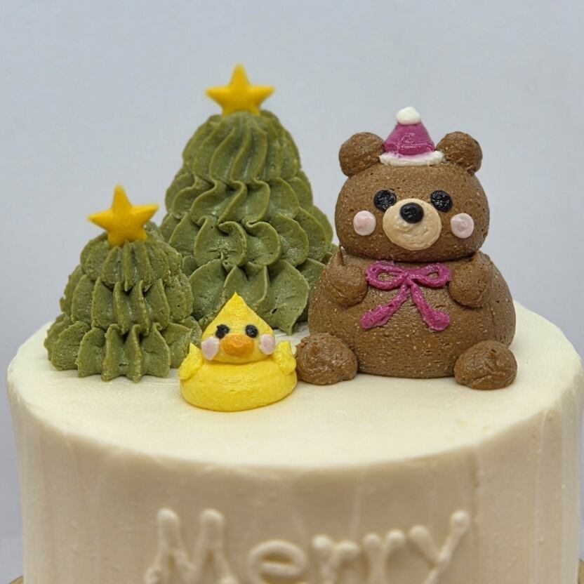 ケーキの上にツリーとくま、ヒヨコをデコレーションした、ほっこり可愛らしく存在感のあるクリスマスケーキです。ケーキの前面には ホワイトでMERRY CHRISTMAS の文字が入っています。