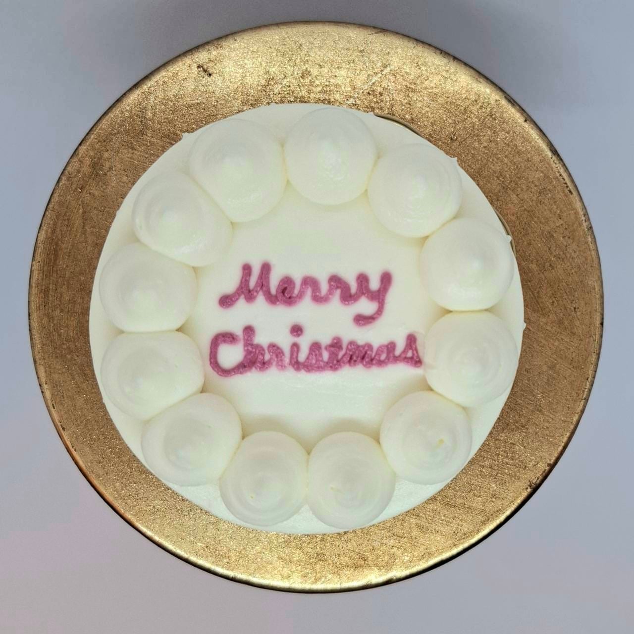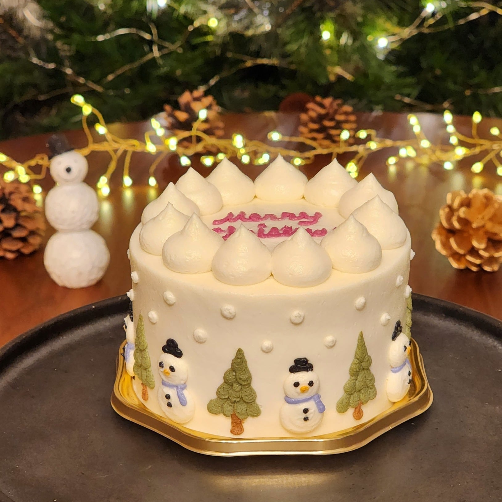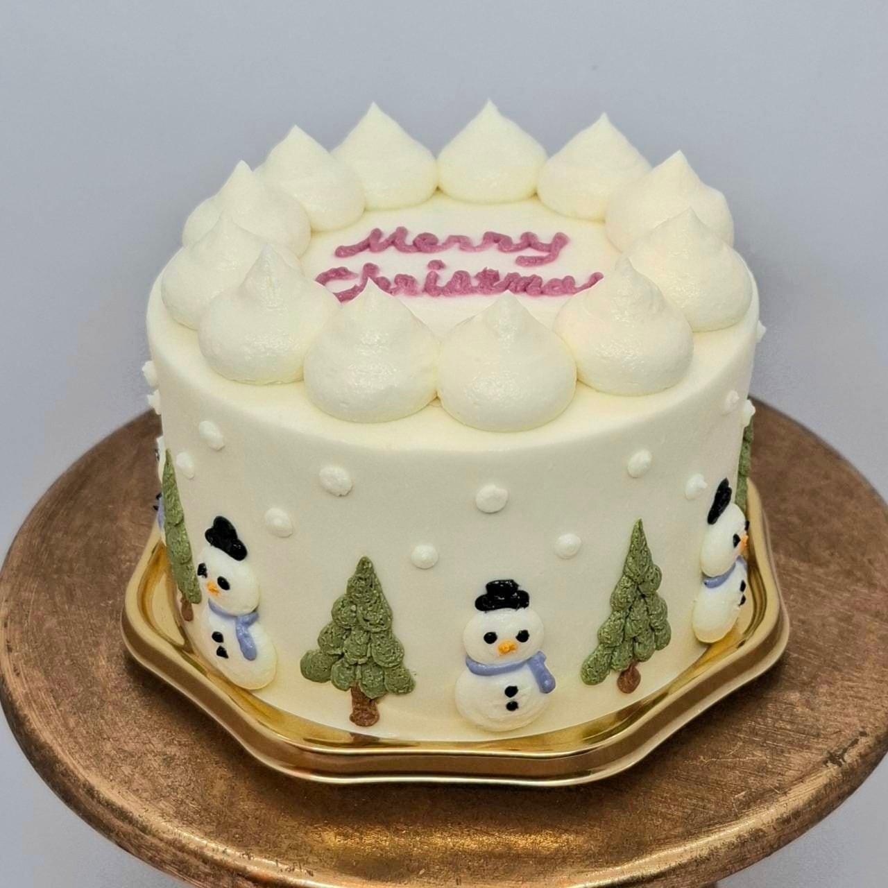 ケーキの側面に雪だるまとツリーが1周描かれている可愛らしいデザインのケーキです。